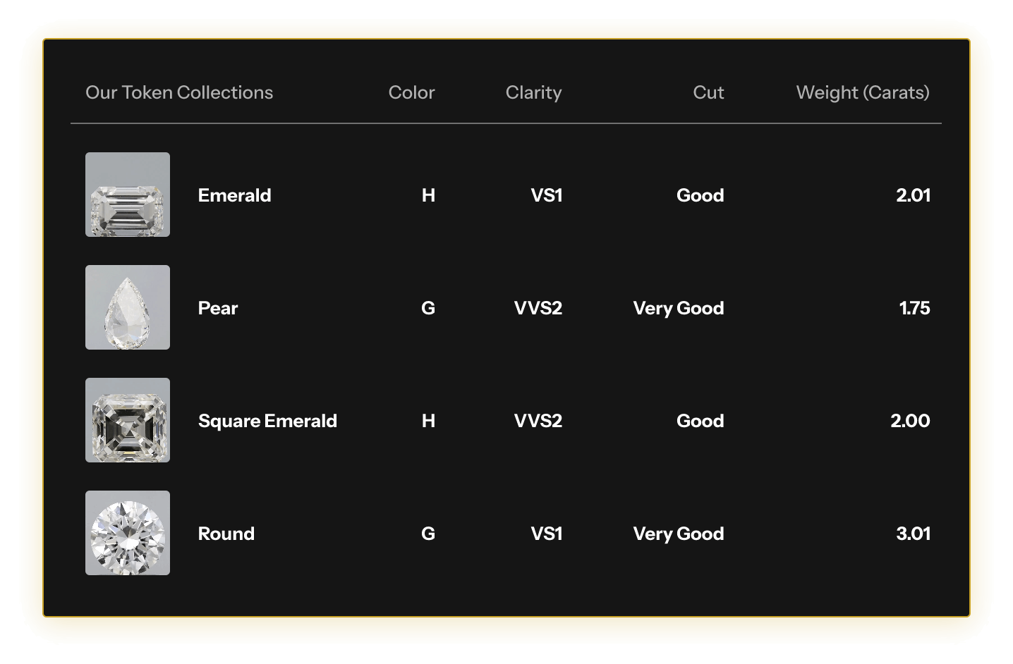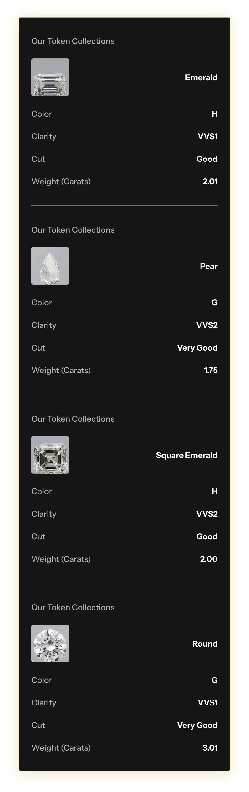 Every diamond on our platform is meticulously tokenized as a unique NFT, establishing an immutable digital record of ownership. This not only secures your claim to each gem but also traces its provenance. Ownership via the blockchain means that your investment is protected and verifiable, building a foundation of security and trust that enhances the value of your assets.